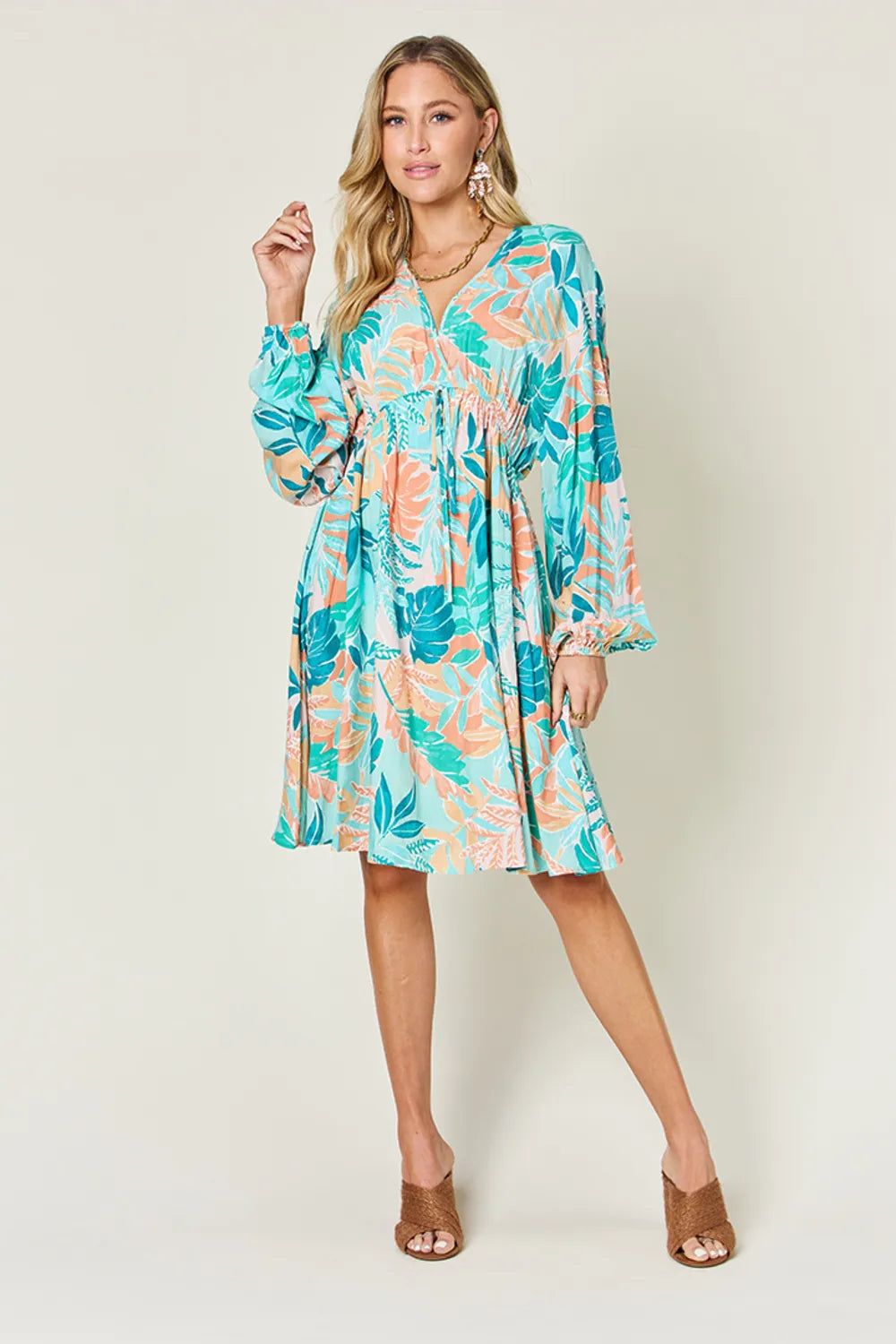 Double Take Full Size Printed V-Neck Drawstring Dress
