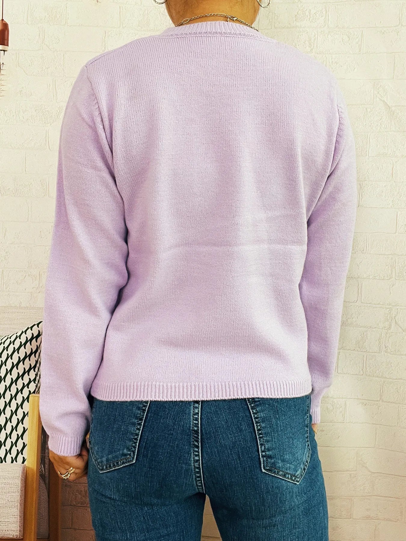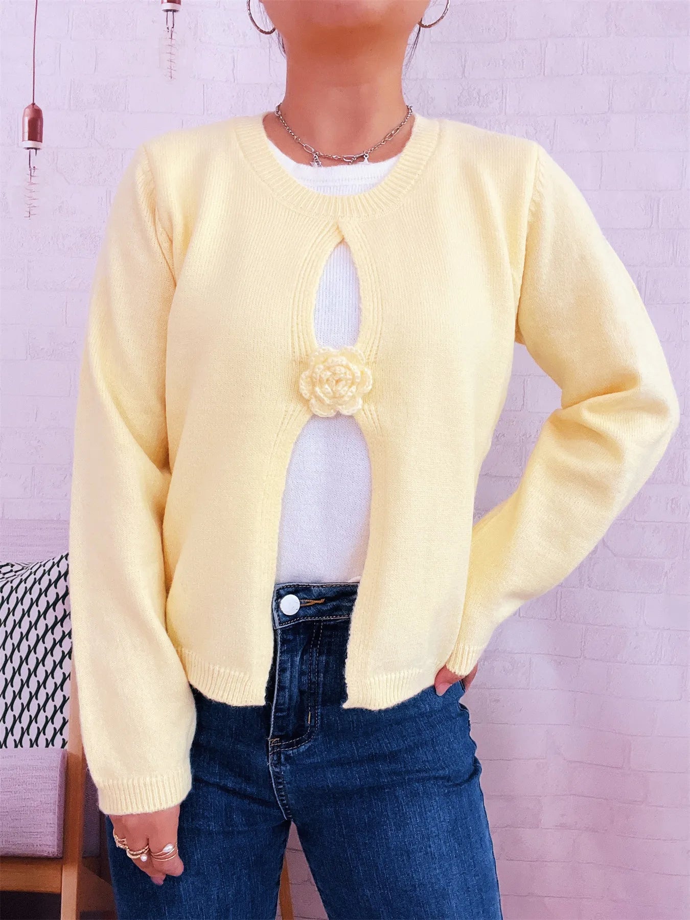 Flower Contrast Round Neck Sweater