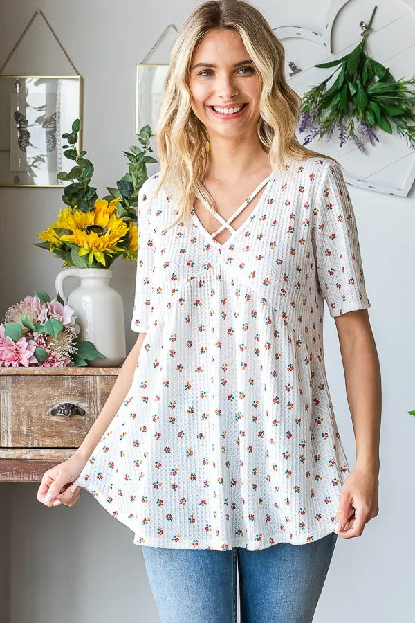 The Crisscross Ditsy Floral Babydoll Top is a sweet and charming addition to any closet. The crisscross detail adds a stylish flair to the top, while the ditsy floral print gives it a soft and feminine touch. This babydoll top is perfect for creating a cute and romantic look, ideal for a day out or a casual outing.