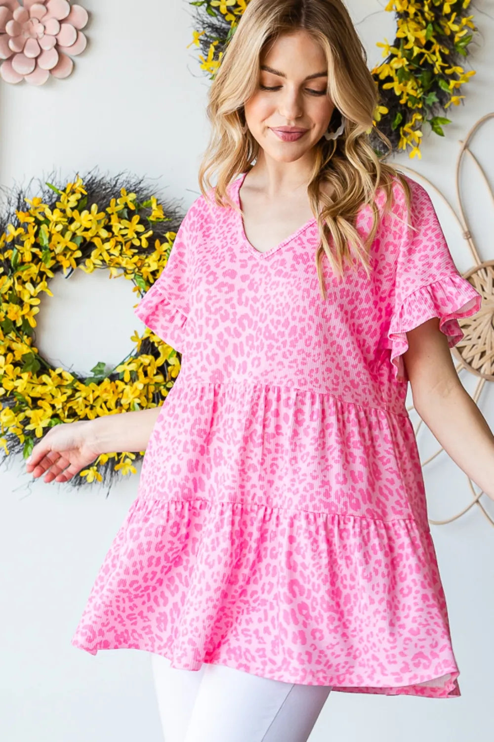 The Leopard Ruffle Trim Short Sleeve Top is a fierce and fashionable choice for any occasion. The leopard print adds a bold and trendy touch, while the ruffle trim adds a feminine and playful element. Pair it with jeans for a casual look or dress it up with a skirt for a night out.