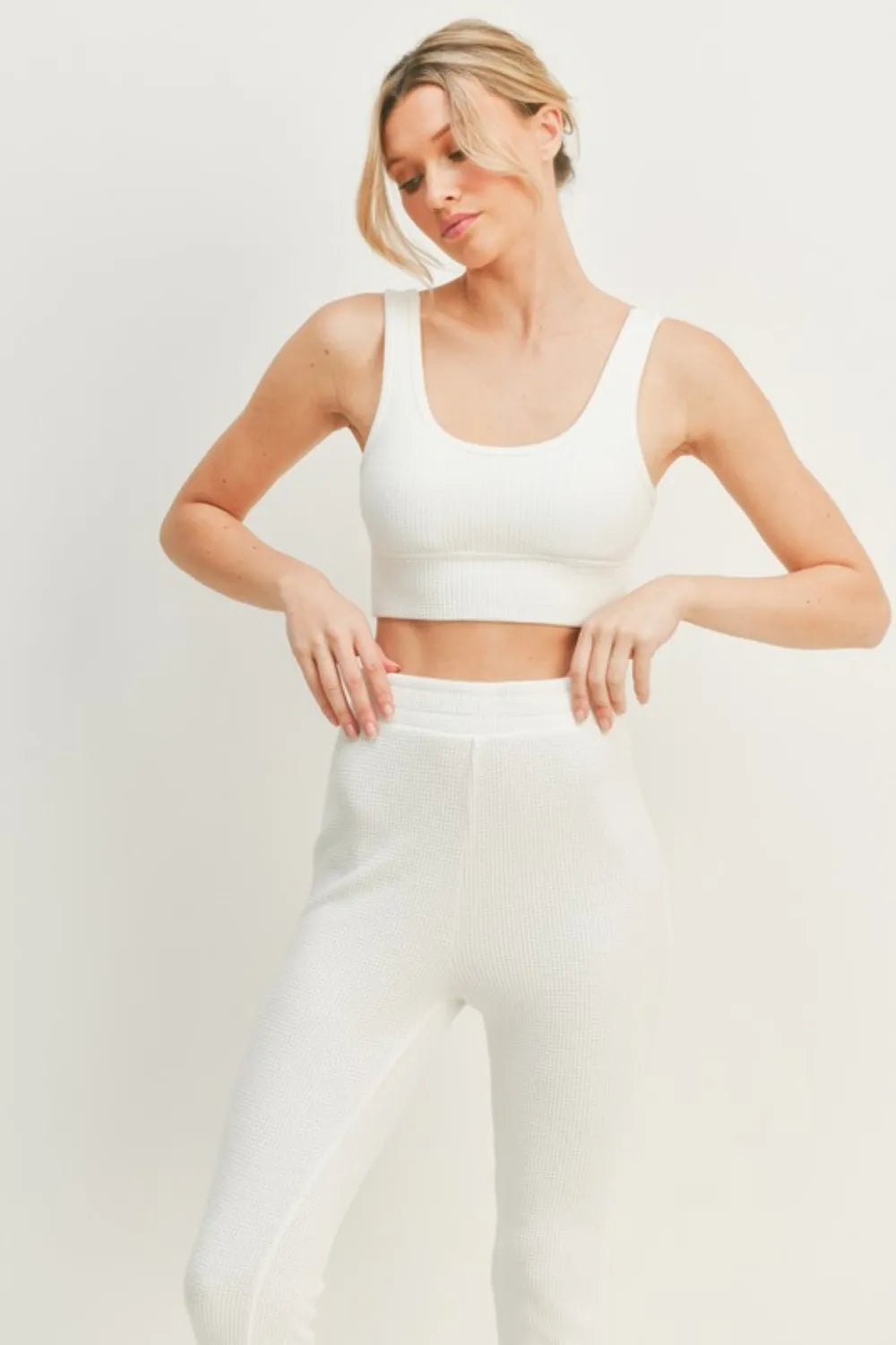 This set combines the coziness of waffle-knit fabric with a trendy design. The lounge tank offers a supportive yet relaxed fit, perfect for all-day wear, while the flare pants boast a flattering silhouette that transitions effortlessly from lounging at home to casual outings.