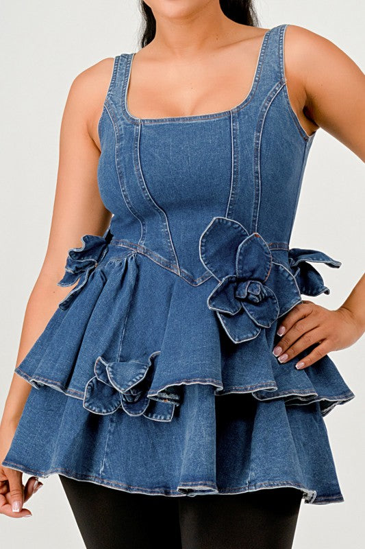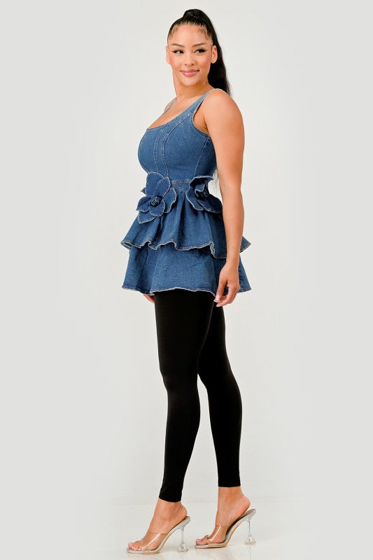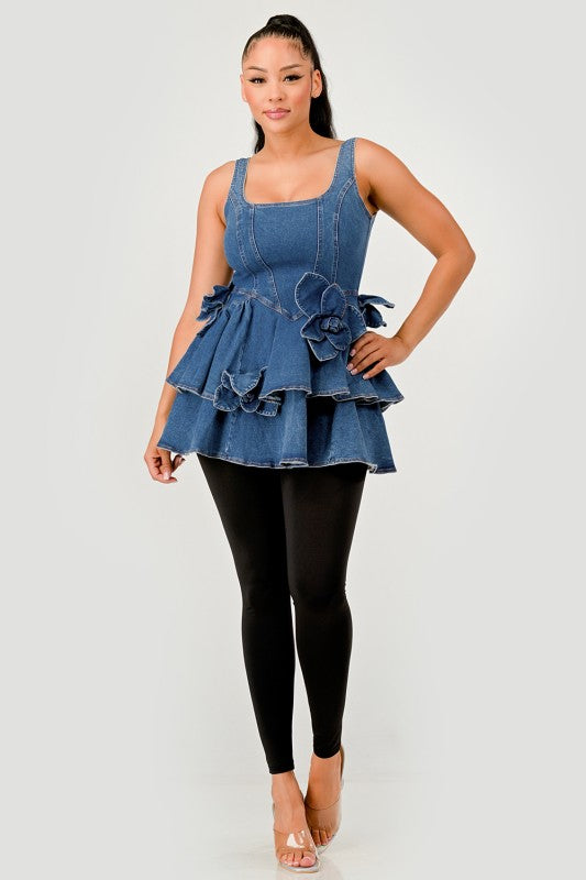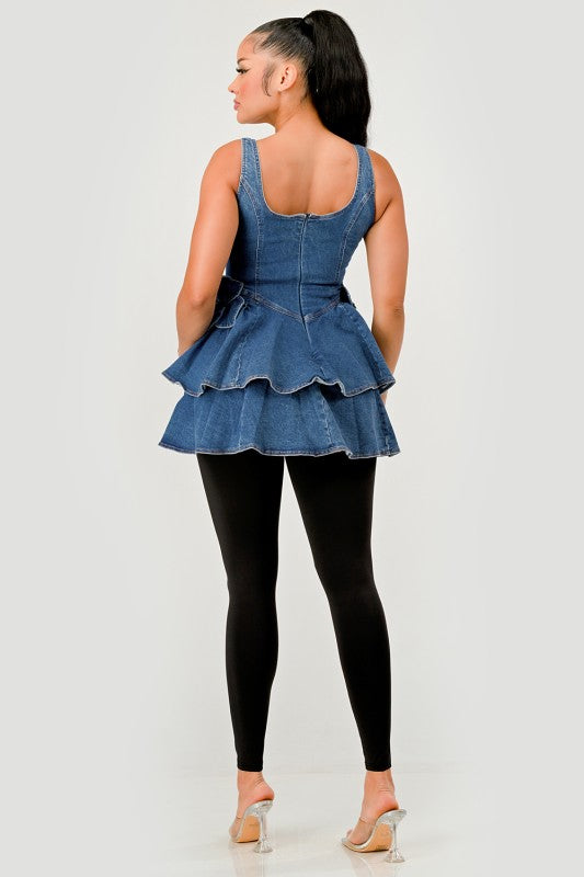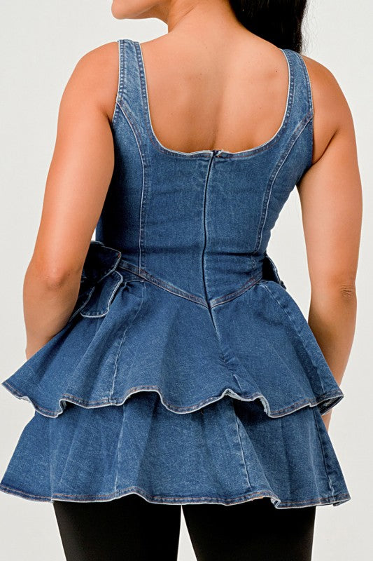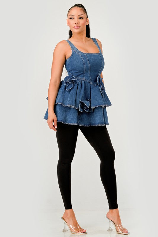 This denim peplum top is designed with a square neckline and fitted bodice for a flattering shape. The layered ruffle... Read more