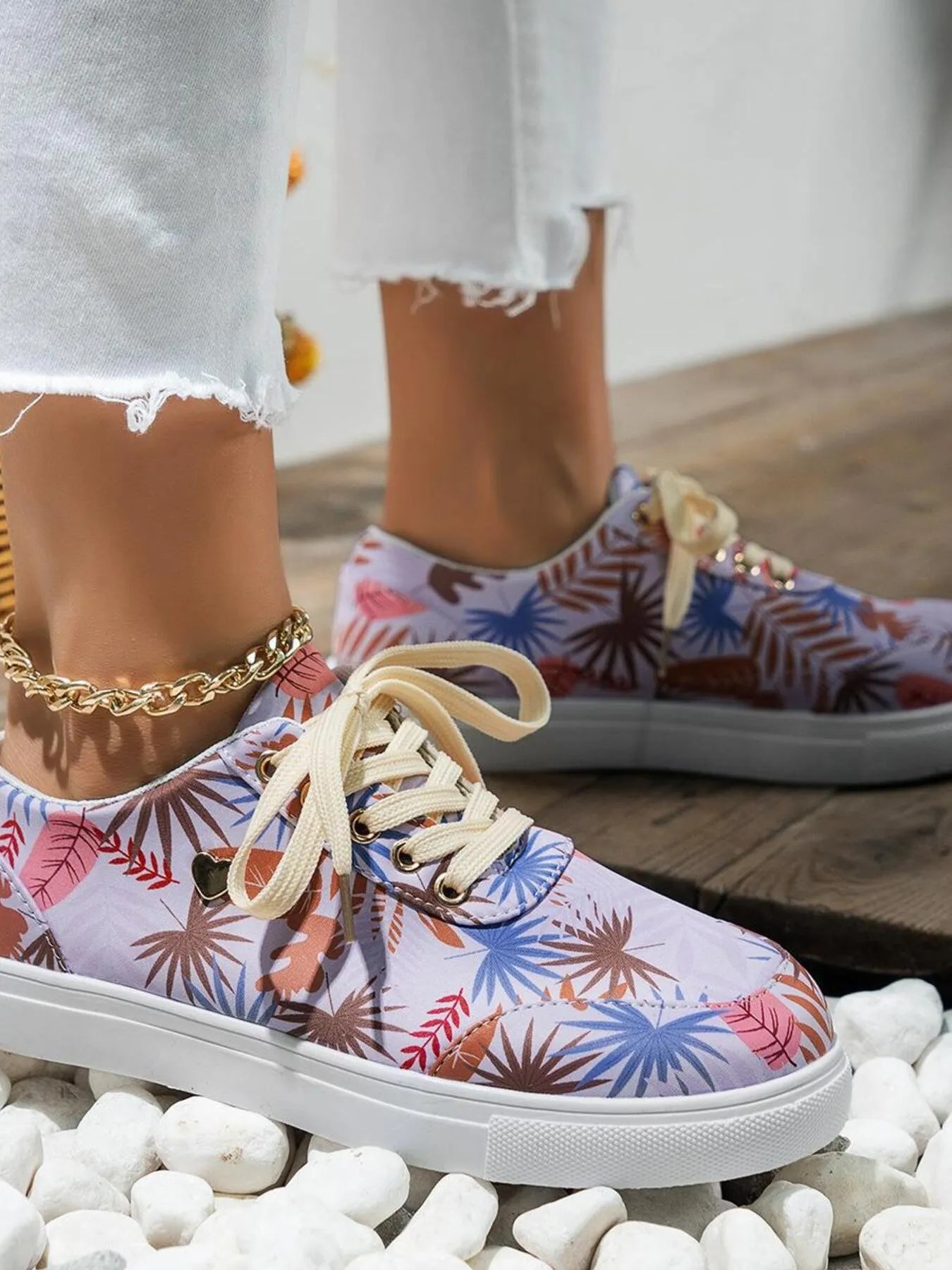 These eye-catching canvas sneakers feature a stunning tropical leaf print in shades of blue and purple against a white background. The lightweight canvas construction ensures breathability and comfort for all-day wear. The classic lace-up design offers adjustable fit, while the durable white rubber sole provides excellent traction. Perfect for casual outings and summer activities, these sneakers combine style with functionality. The high-quality materials and contemporary design make them ideal for both fashion-conscious individuals and comfort seekers.