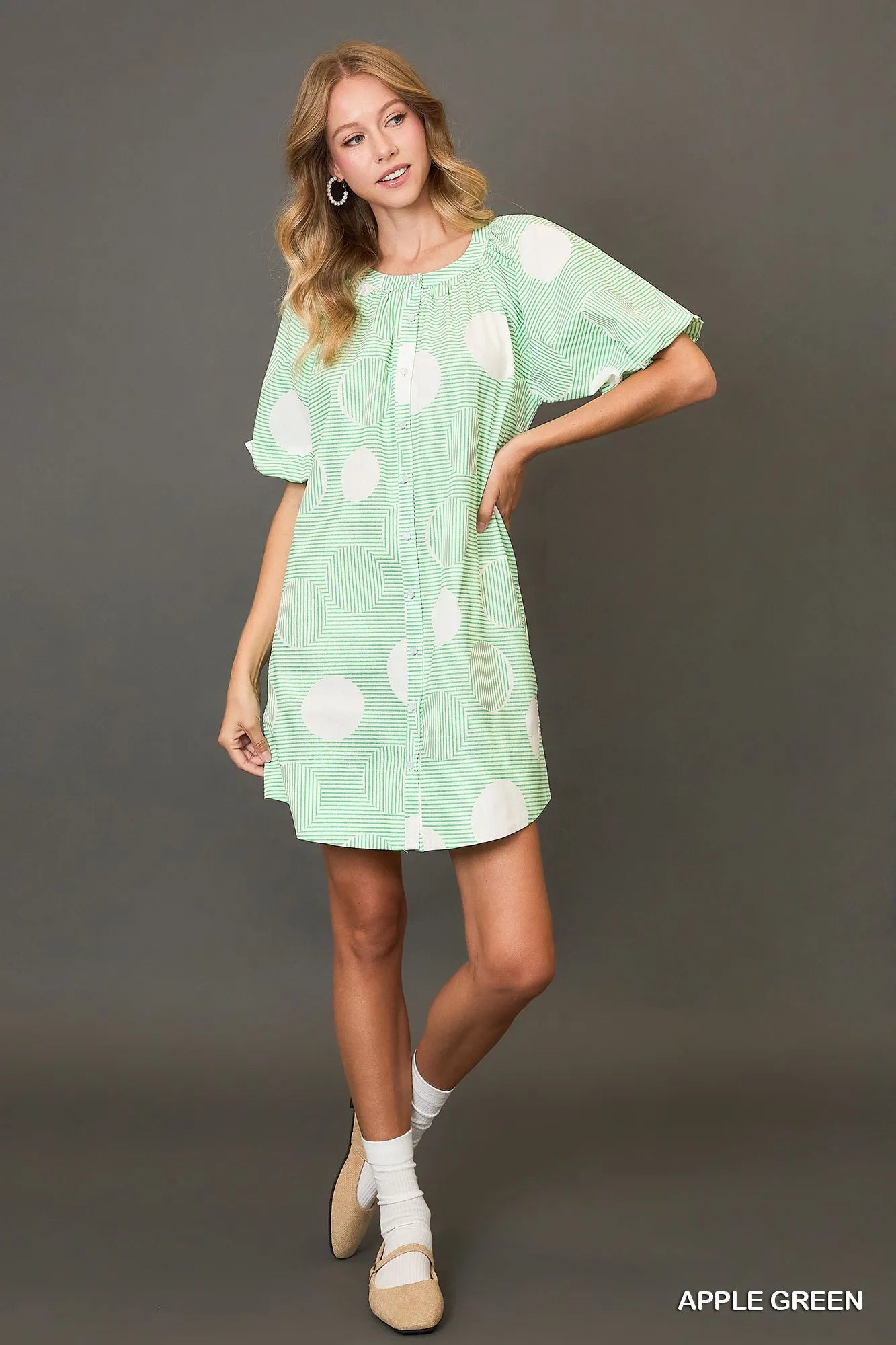 This button-down puff sleeve mini dress features a playful combination of stripe and dot prints, creating a unique and eye-catching look. The puff sleeves add a touch of drama and femininity, elevating the overall style of the dress. The button-down design adds a classic element, making it easy to wear and style. With its mini length, this dress is perfect for both casual outings and special occasions. Embrace a trendy and chic aesthetic with this statement-making piece that is sure to turn heads. Upgrade your wardrobe with this versatile dress that seamlessly blends playful prints with flattering details.