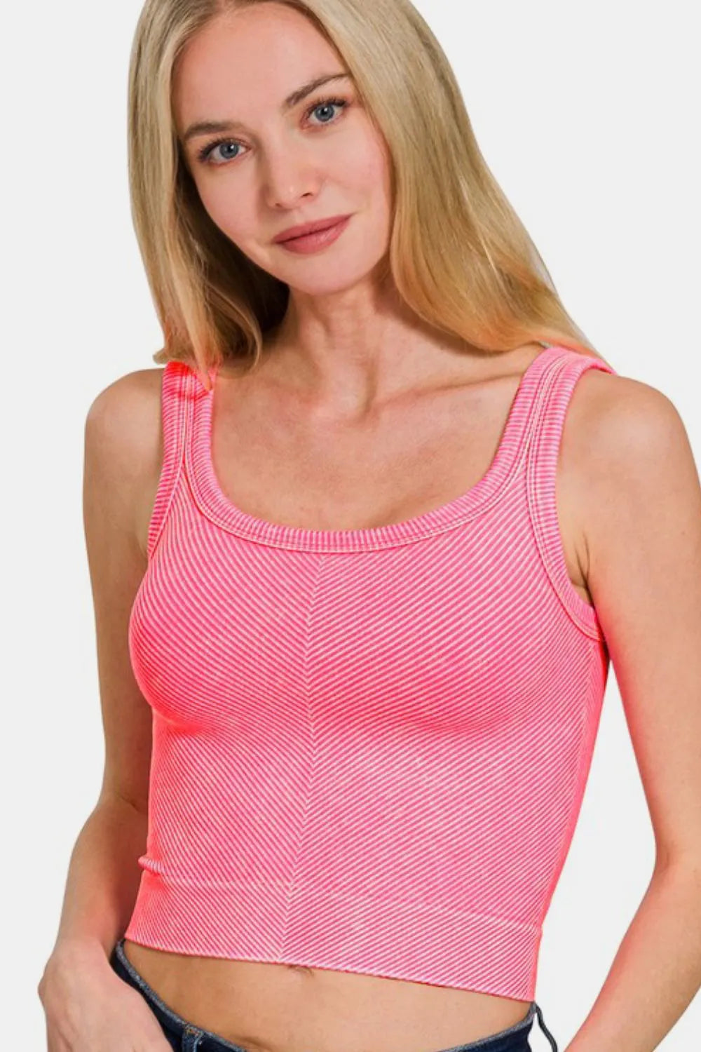The Washed Ribbed Scoop Neck Wide Strap Tank is a versatile and essential piece for your wardrobe. Crafted from washed ribbed fabric, this tank top offers a soft and textured feel for added comfort. The scoop neckline and wide straps create a chic and flattering silhouette, suitable for layering or wearing on its own. The washed ribbed detailing adds a touch of casual sophistication, making it perfect for everyday wear or for dressing up with accessories. Elevate your outfit with this stylish and versatile tank top that can be paired with a variety of bottoms for a range of looks.